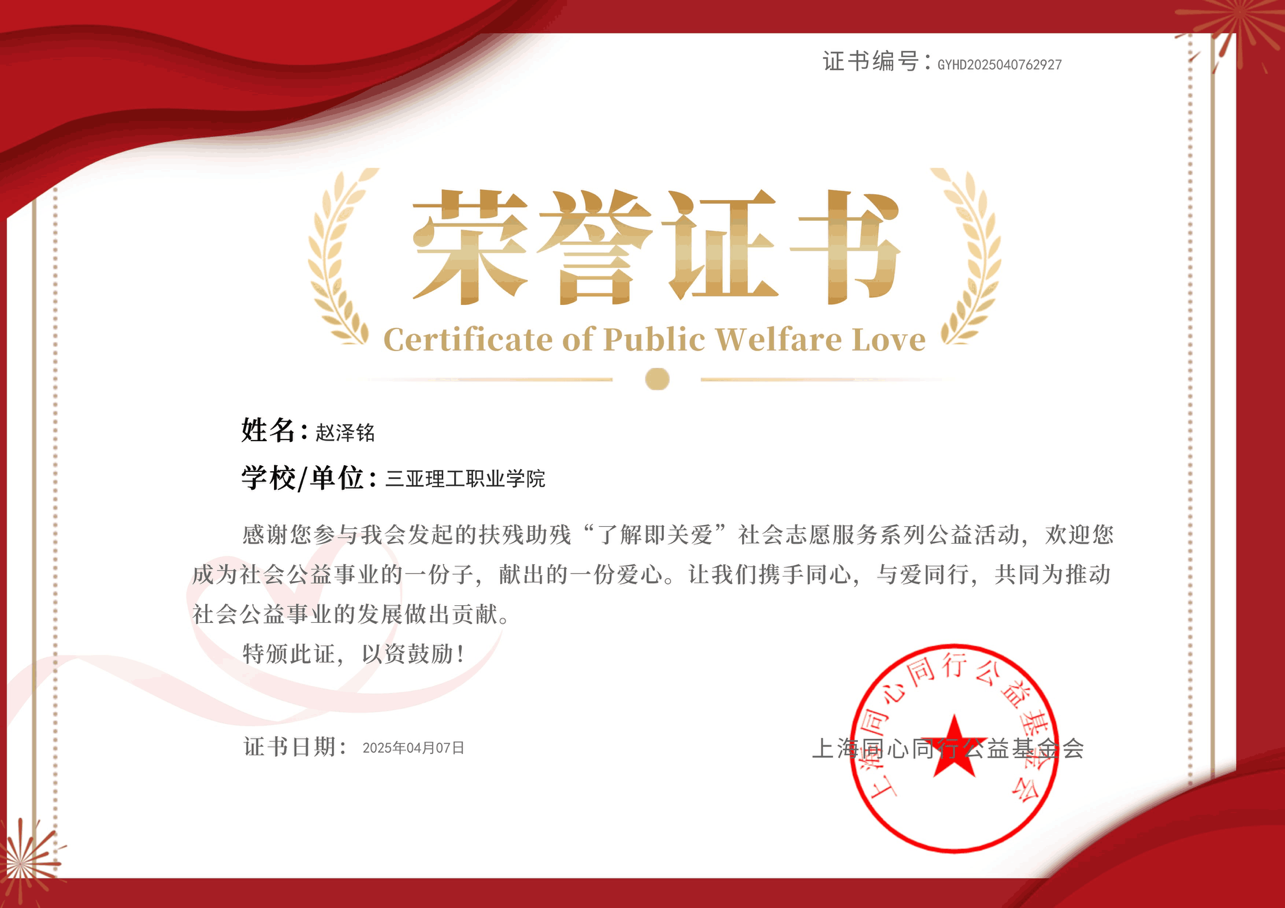 个人荣誉:2023年10月荣获普通话水平测试等级证书、2025年4月荣获上海同心同行公益基金会荣誉证书